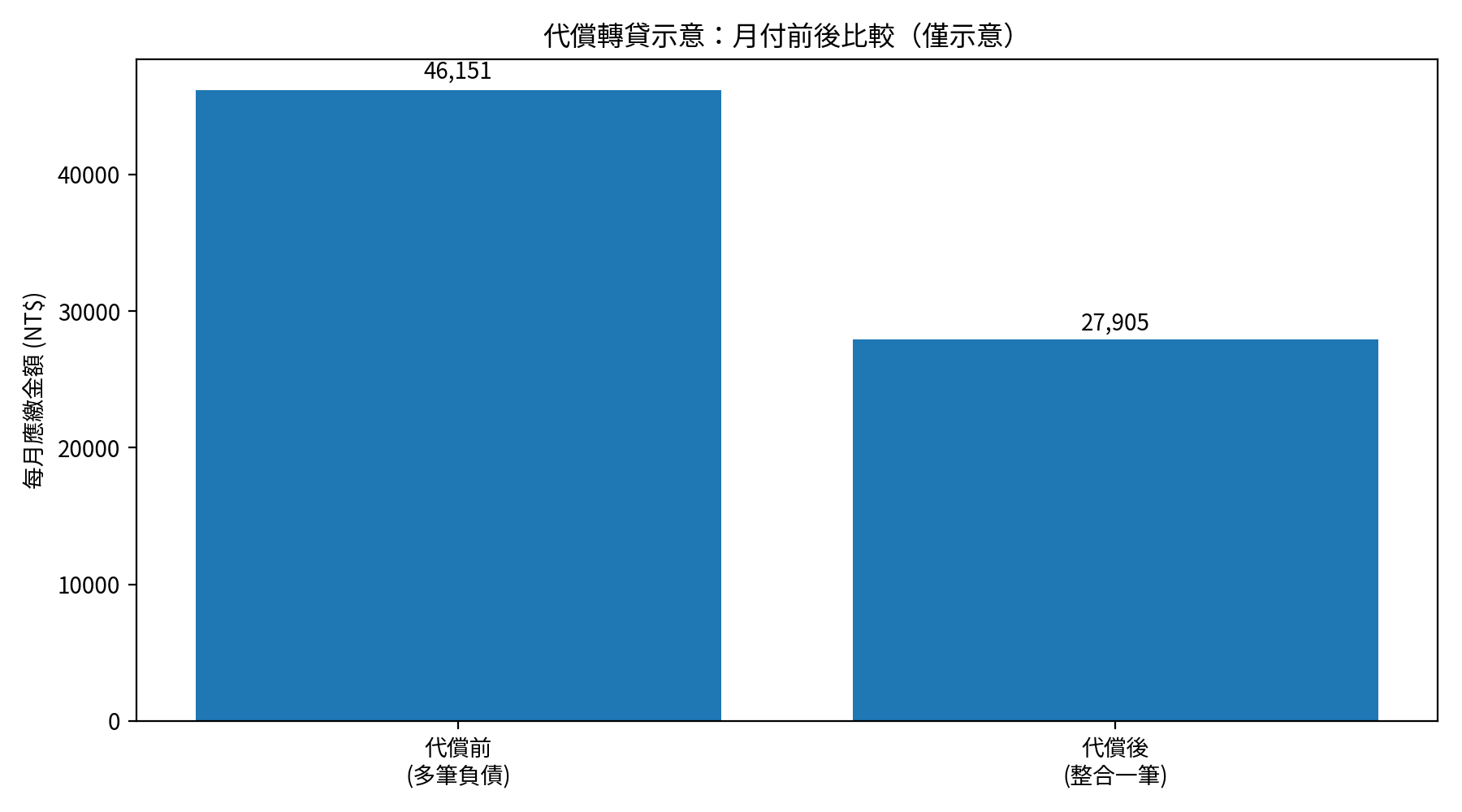 - 代償後:改成單一貸款、拉長年限 → 月付可能下降、現金流更穩